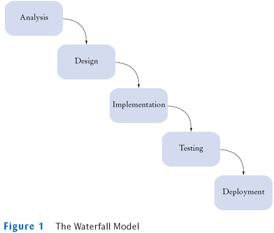 - Sequential process of analysis, design, implementation, testing,